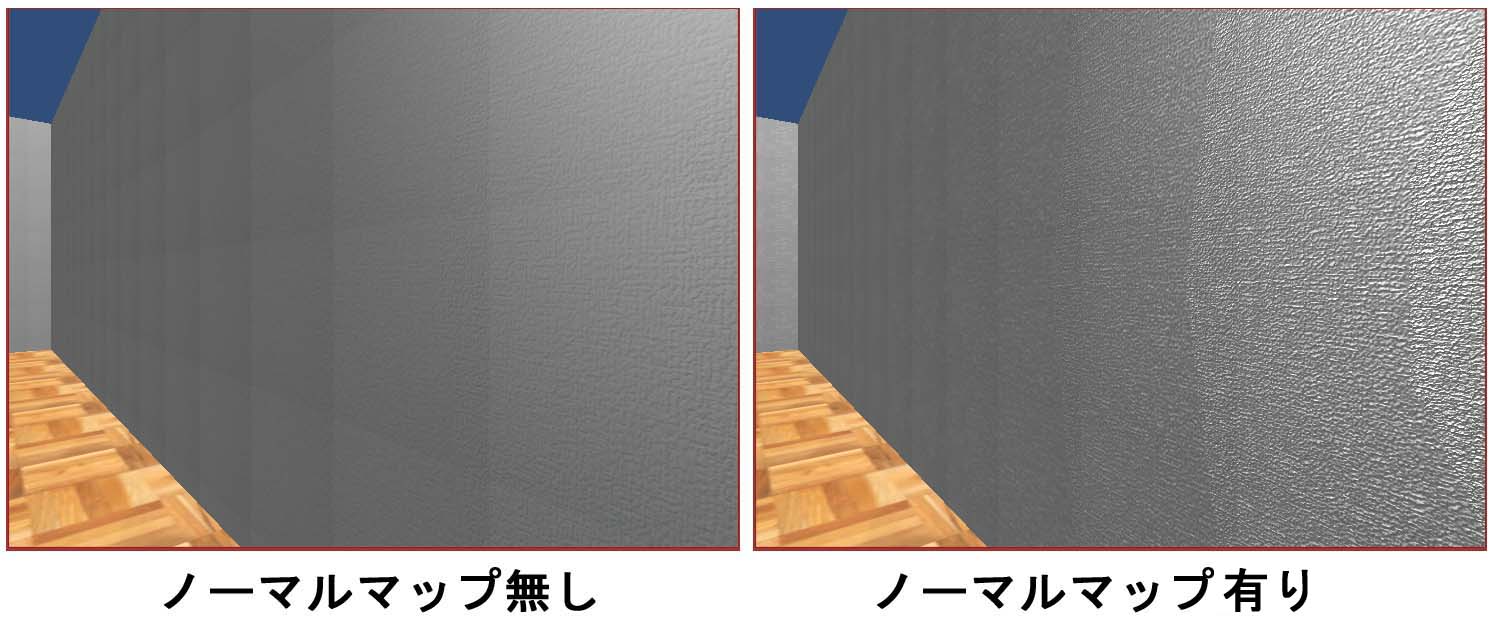 ノーマルマップを適用すると壁の凸凹した感じがうまい具合に表現できているのがわかると思います。